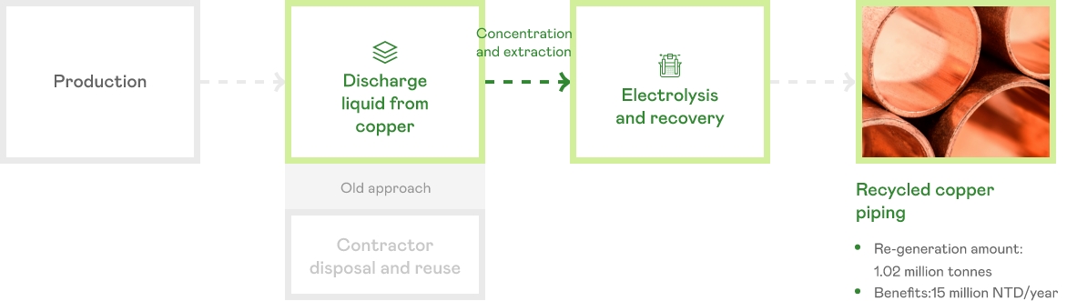 - Waste liquid containing copper from the etching process is processed using electrolysis into high-purity copper piping for use in other industrial applications.