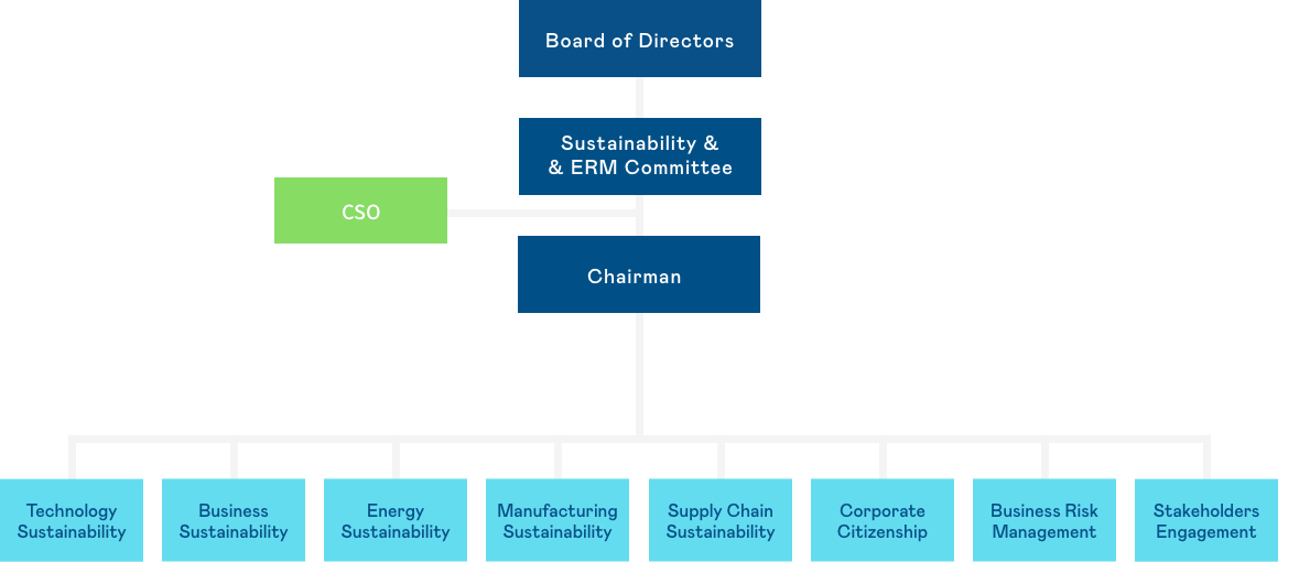 The "Sustainability & ERM Committee" consists of the Chairman and 2 independent directors. They meet twice a year and supervise sub-committees focused on sustainability and risk. Senior managers lead the sub-committees, translating the vision into goals and strategies, conducting monthly reviews, reporting major issues quarterly to the Chairman for decisions, and reporting annually on operations to the board following CSR guidelines.