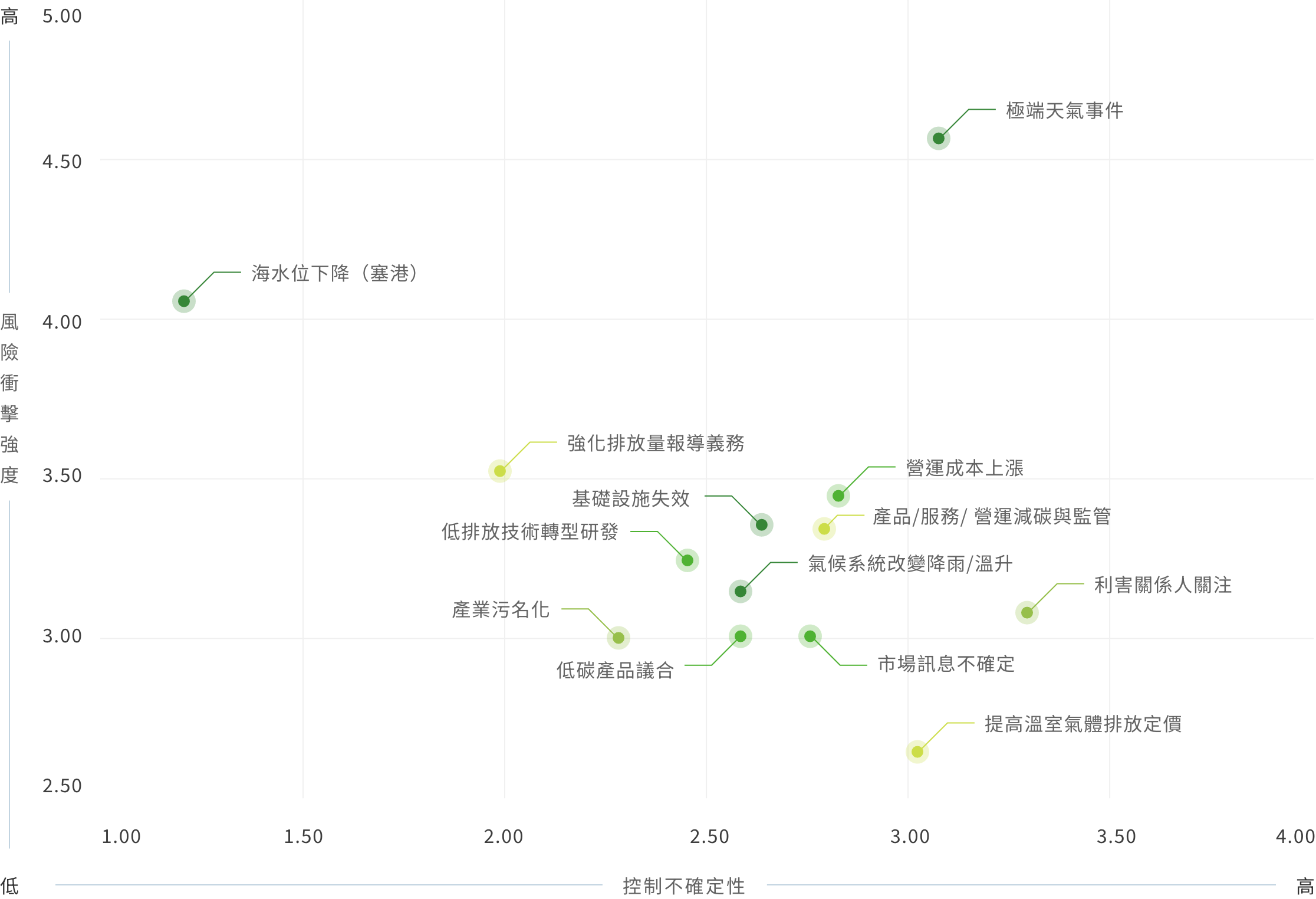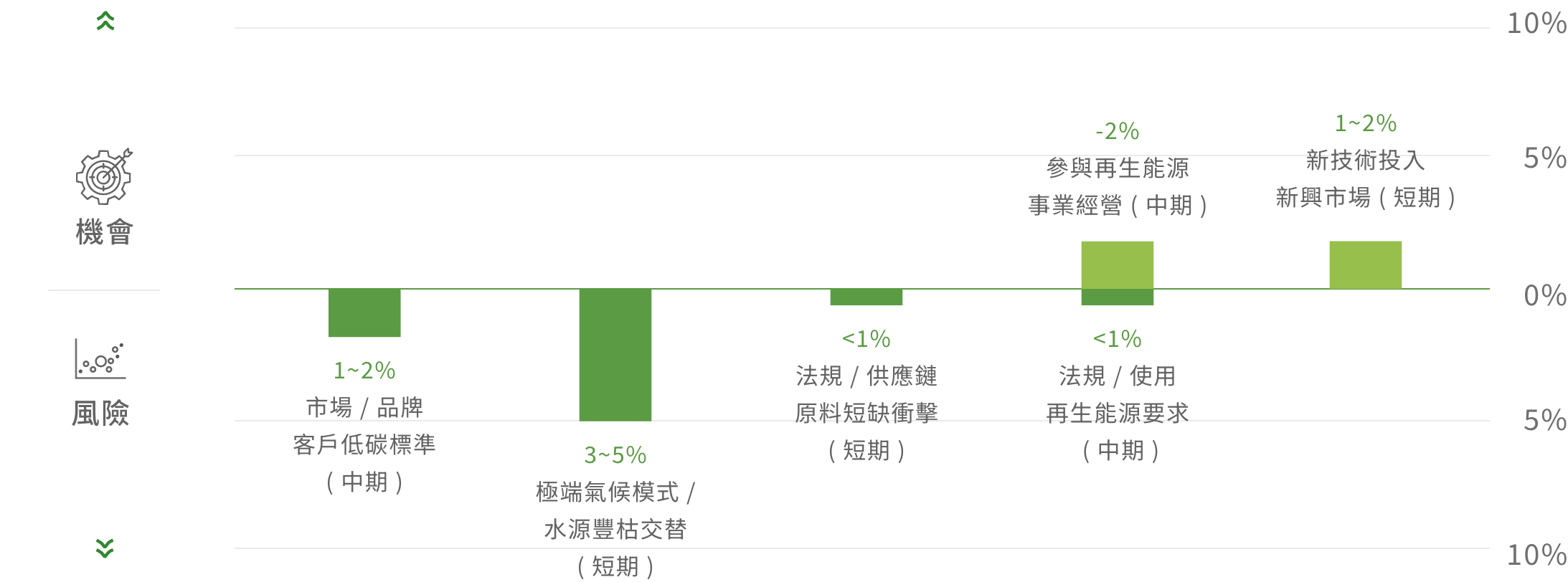 | 國際倡議與法規遵循 | 低碳轉型下之國際倡議目標與法規遵循所衍生之財務成本 |