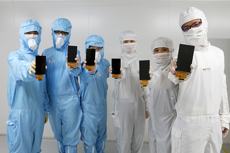 Engineers of WWW.乐鱼 Kunshan fab demonstrate the fab’s first 5.5-inch full HD LTPS LCD |